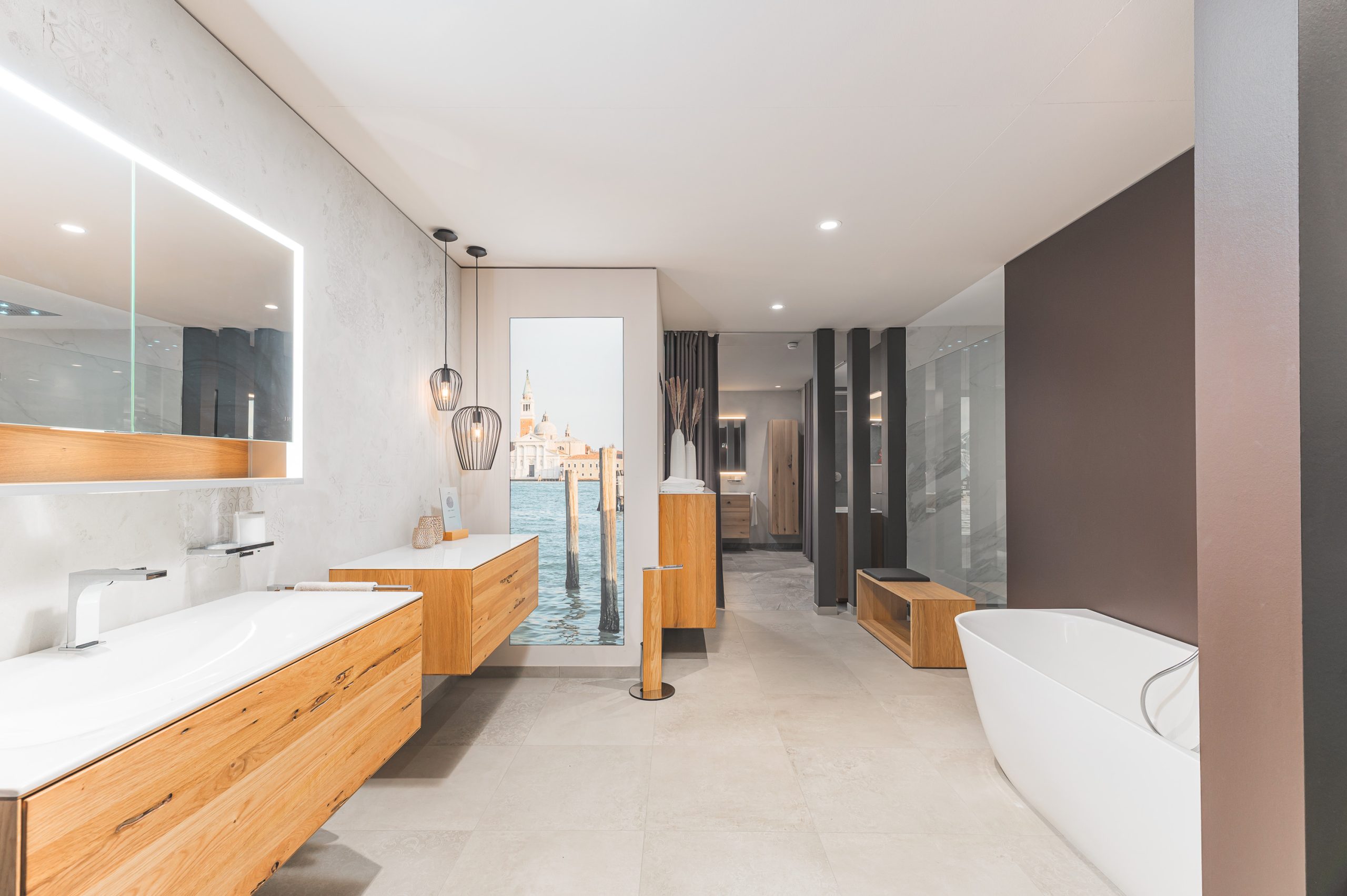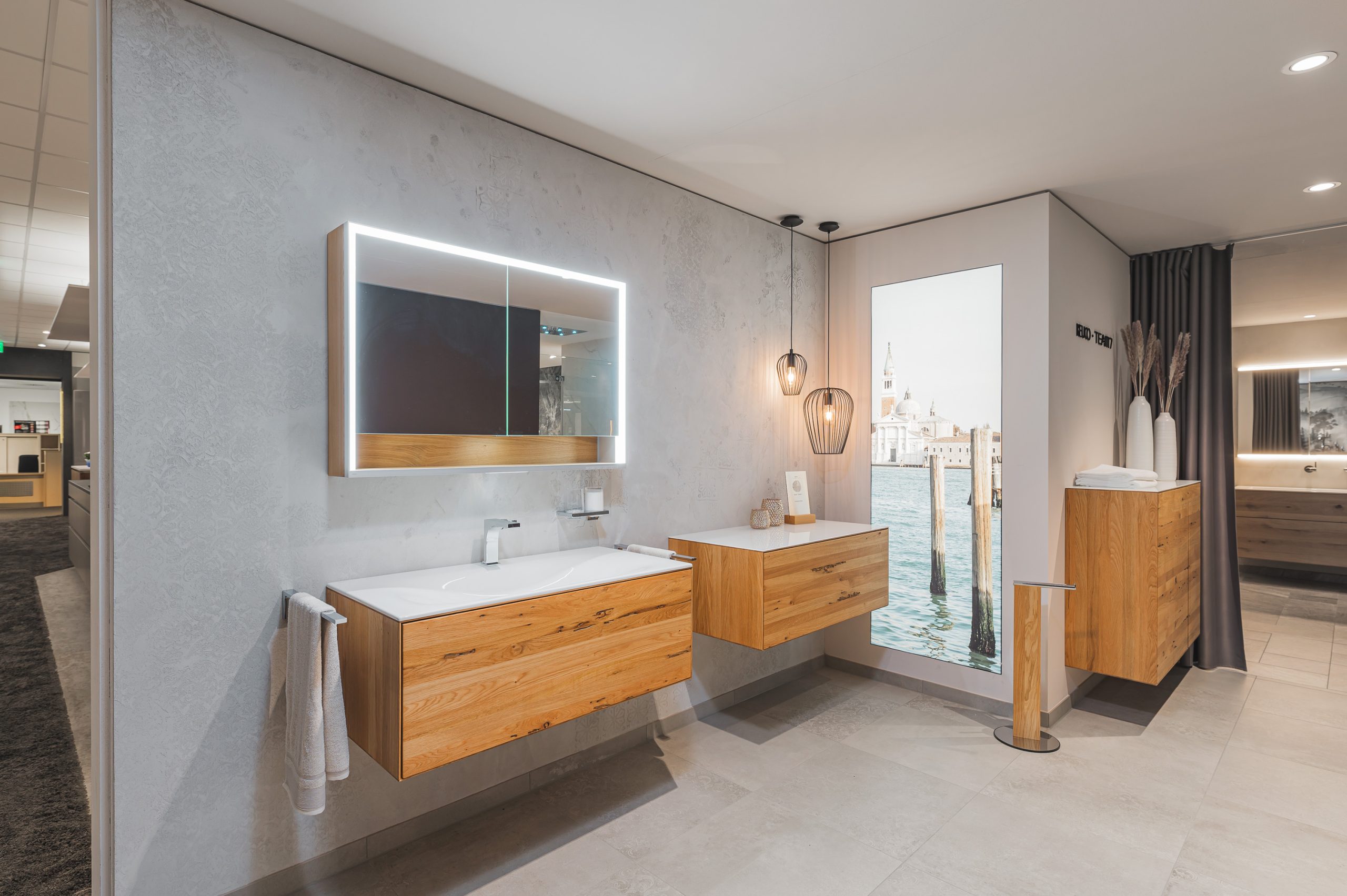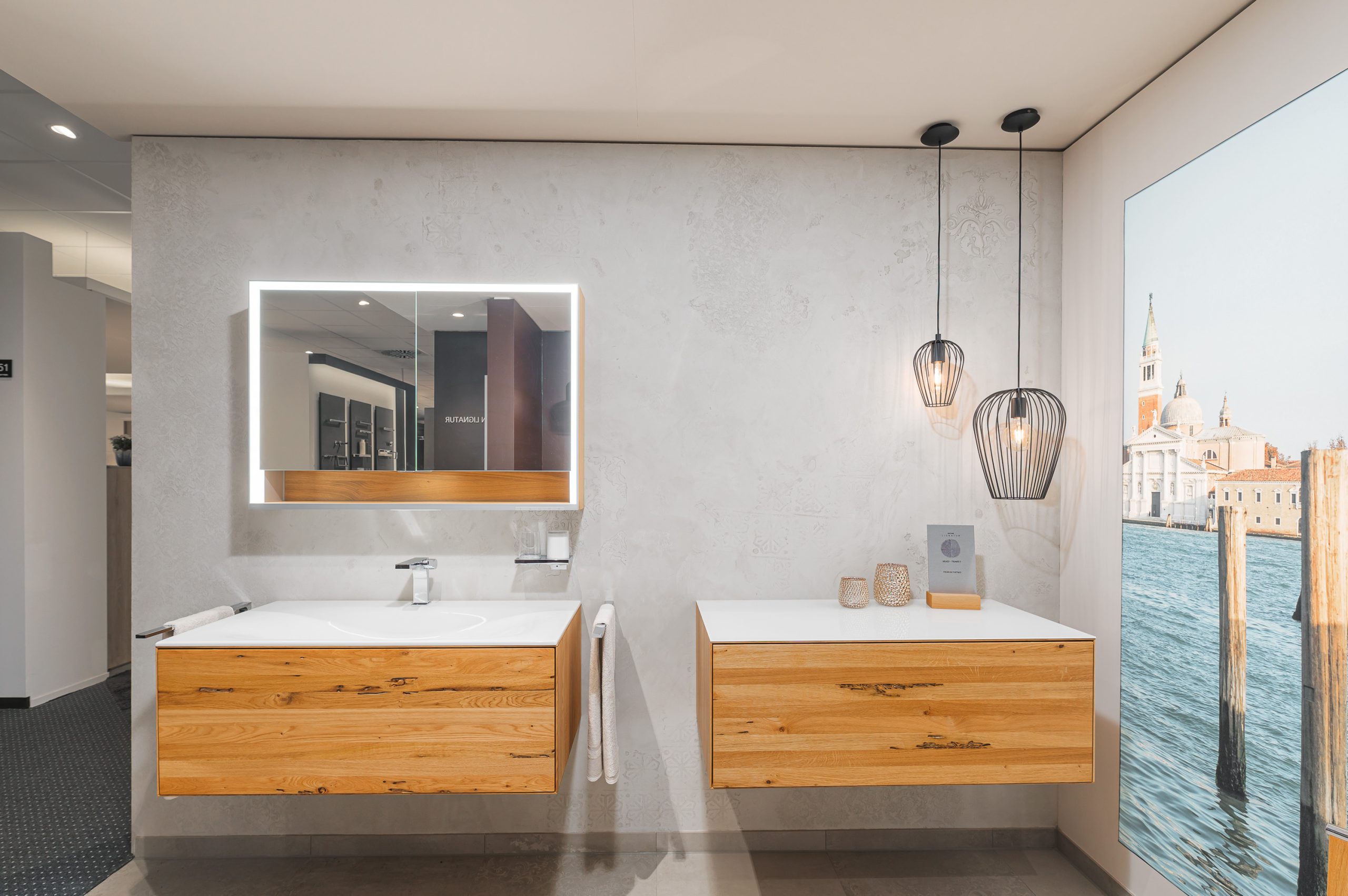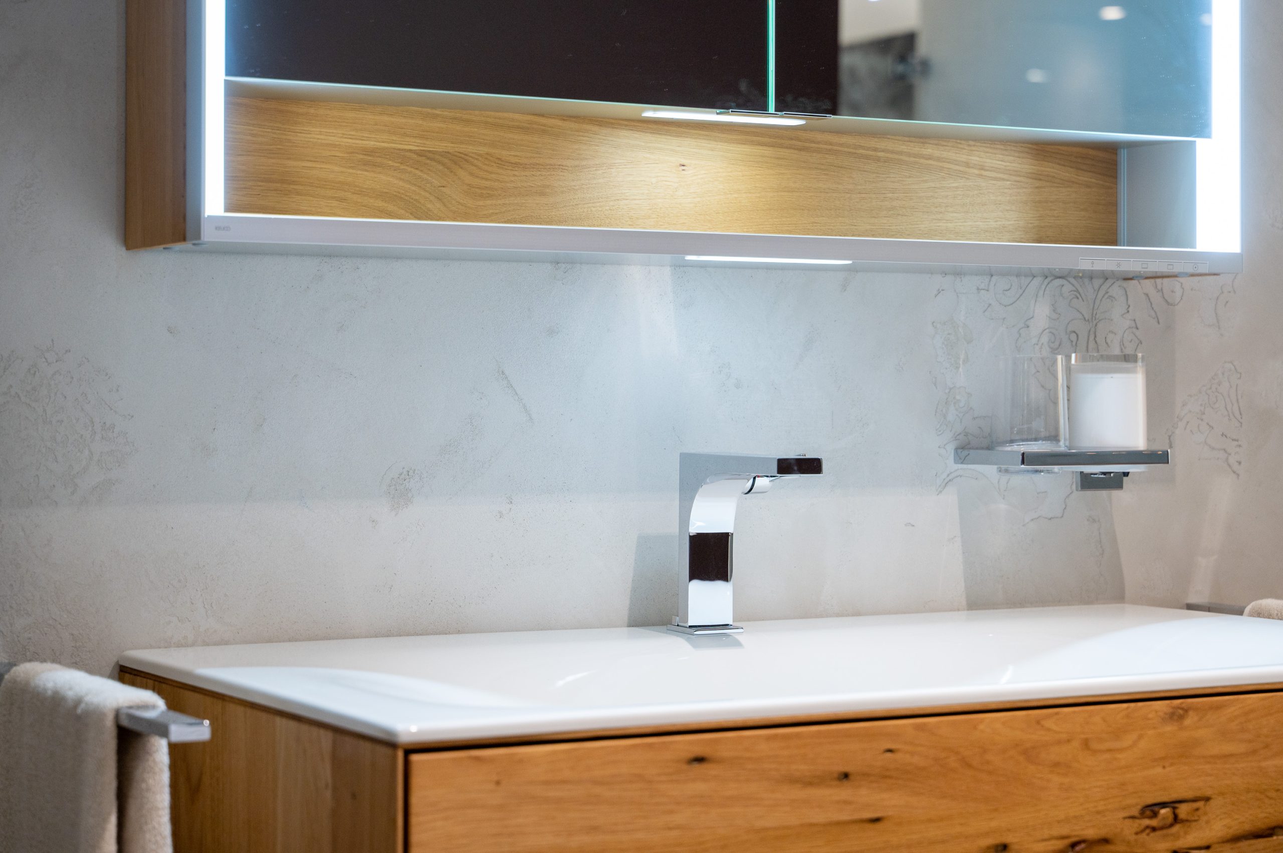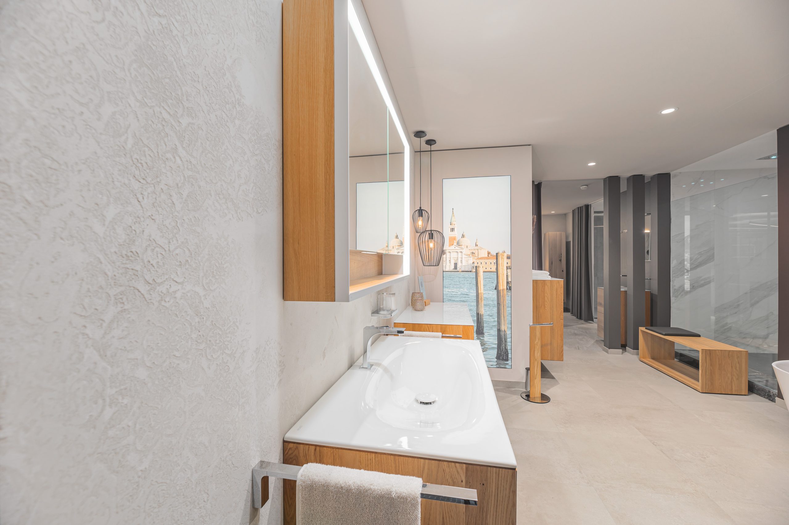 Diese Technik überzeugte nicht nur durch ihre edle Optik und die feine, individuelle Textur, sondern auch durch ihre technische Eignung: Kalkpress-Oberflächen sind besonders langlebig, feuchtigkeitsbeständig und perfekt für den Einsatz in Badezimmern geeignet. Das Ergebnis ist eine Wandgestaltung, die durch ihre elegante Zurückhaltung ebenso besticht wie durch handwerkliche Präzision – ein echter Blickfang in der Ausstellung.