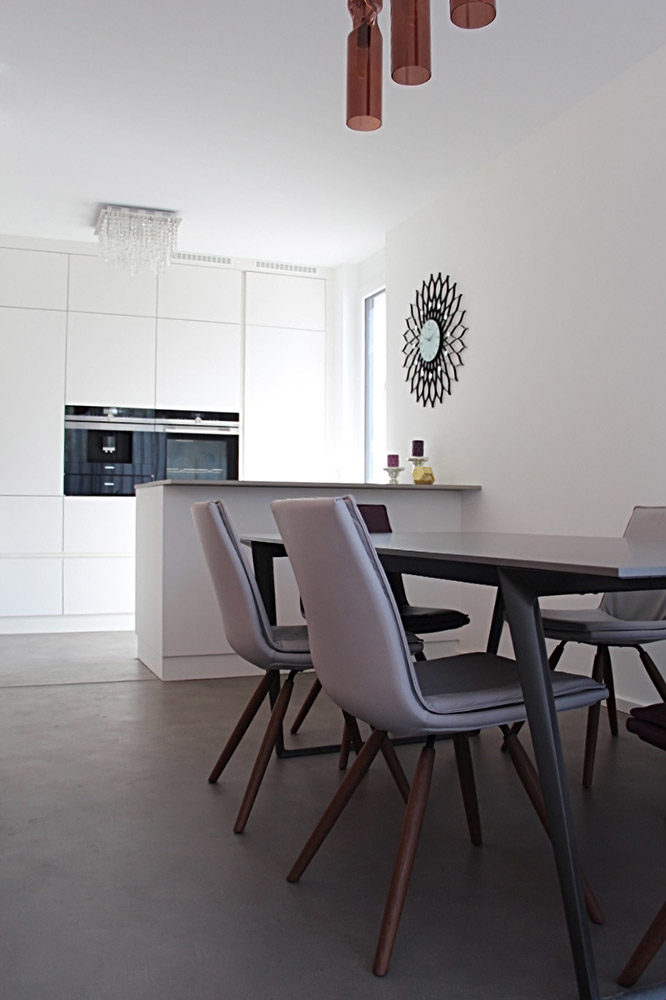 Um diesem Anspruch gerecht zu werden, mussten zahlreiche bauliche Feinheiten von Anfang an berücksichtigt werden. Dazu zählten unter anderem Setzungsspuren durch das Bauwerk, die Integration einer Fußbodenheizung sowie die großflächigen Fensterfronten, die besondere Anforderungen an den Wand- und Bodenanschluss stellten. Nur durch die ganzheitliche Betrachtung aller technischen und gestalterischen Aspekte konnte das gewünschte, nahezu makellose Ergebnis erzielt werden.